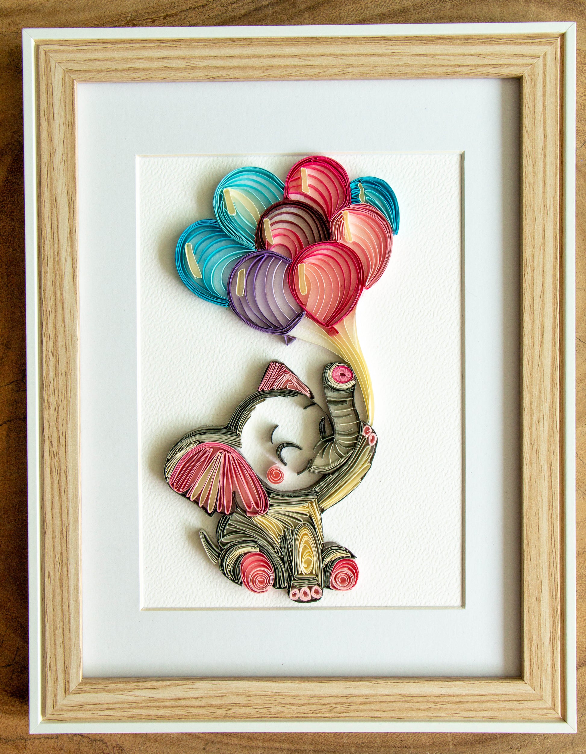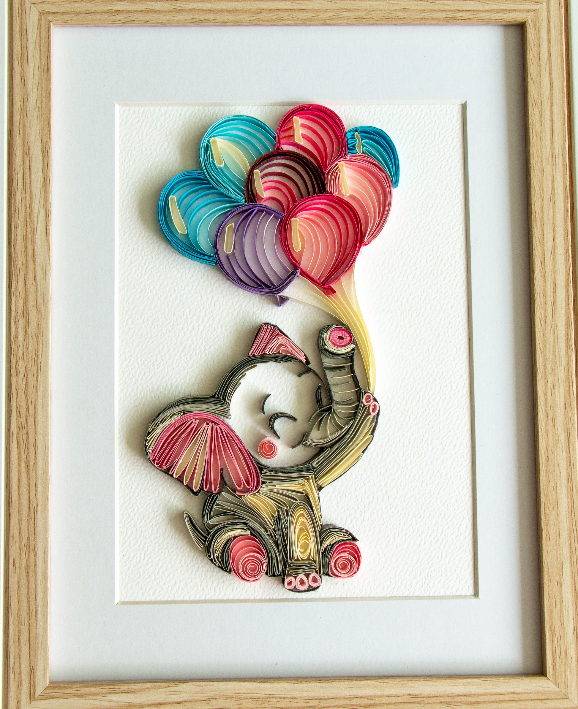 Small baby elephant with balloons from paper. Baby room present quilling artwork. ArtyMargarita.com Unique artworks from paper.